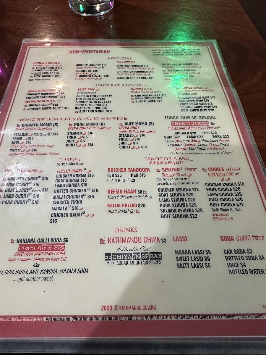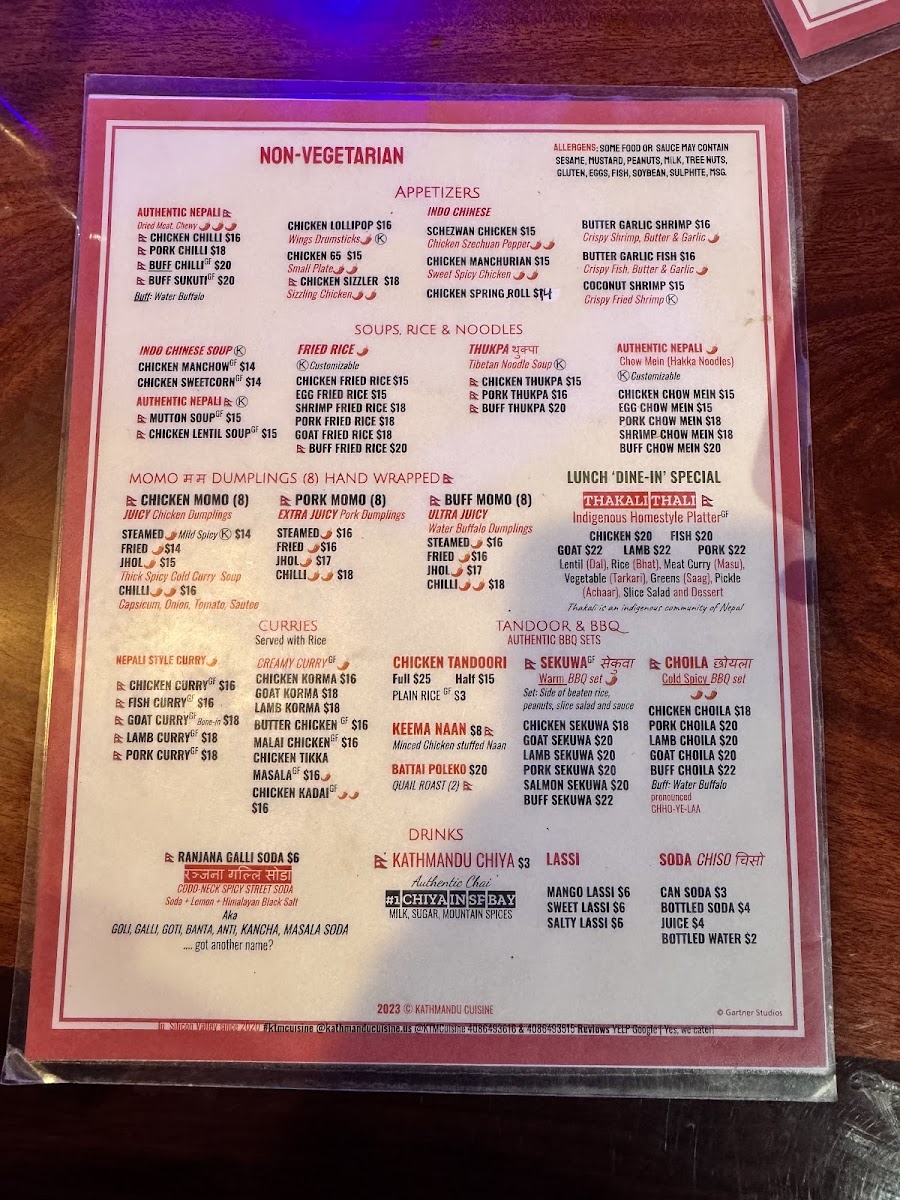 Kathmandu Cuisine Special Authentic Nepali Traditional Homestyle Meal Plate. Lentil (Dal), Rice (Bhat), Specialty Meat Curry (Khasi ko Masu), Vegetable (Tarkari), Aalu Bodi Tama, Greens (Saag), Pickle (Achaar), Slice Salad and Sweets