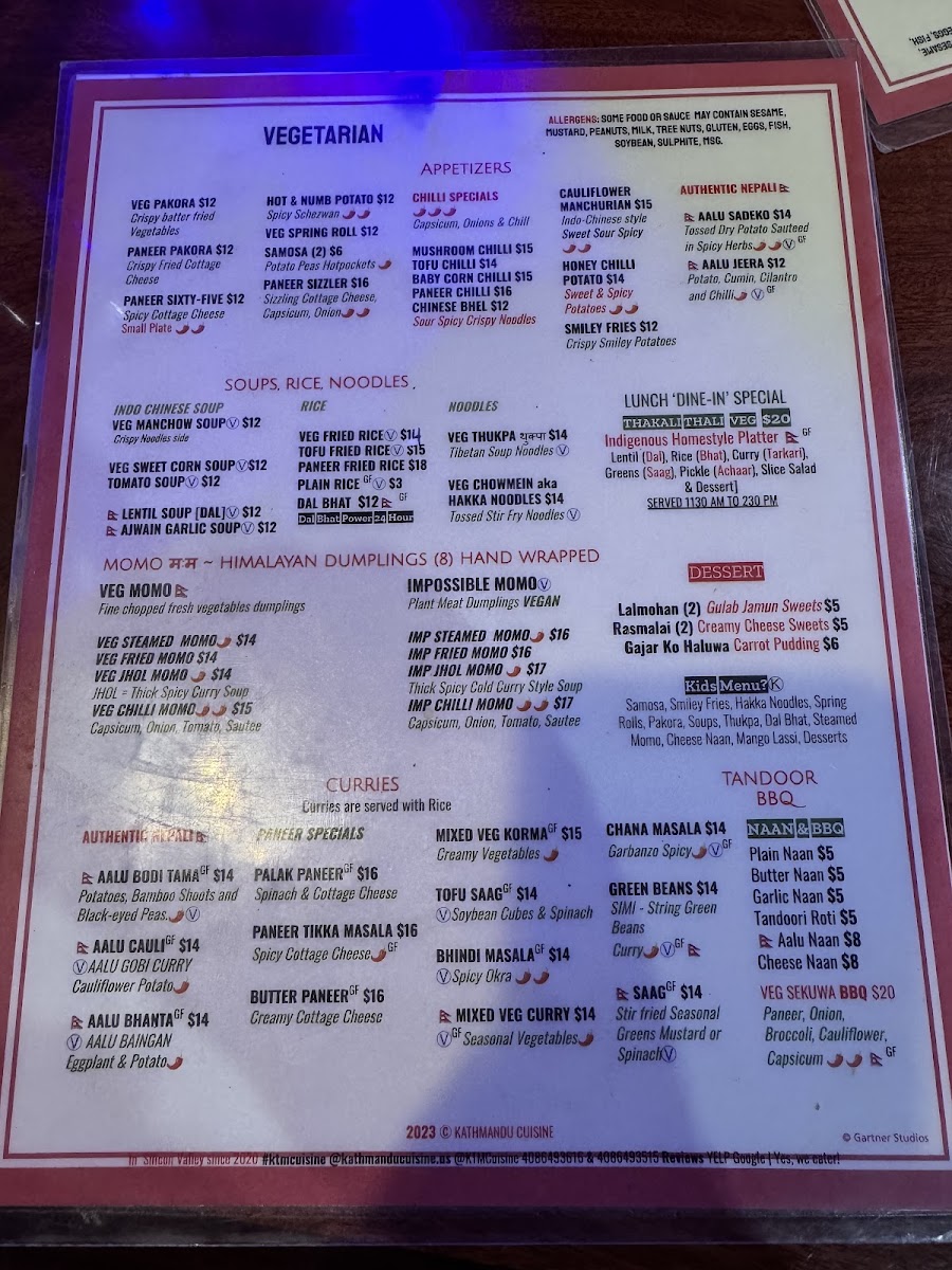 Kathmandu Cuisine Special Authentic Nepali Traditional Home-style Meal Plate Combo. Lentil (Dal), Rice (Bhat), Curry (Tarkari), Aalu Bodi Tama, Greens (Saag), Pickle (Achaar), Slice Salad and Sweets
